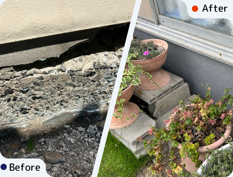 基礎は⾬ざらしになっているお家も多く、ひび割れから⾬が染み込みそれらの補修⼯事が必要になる場合があります。